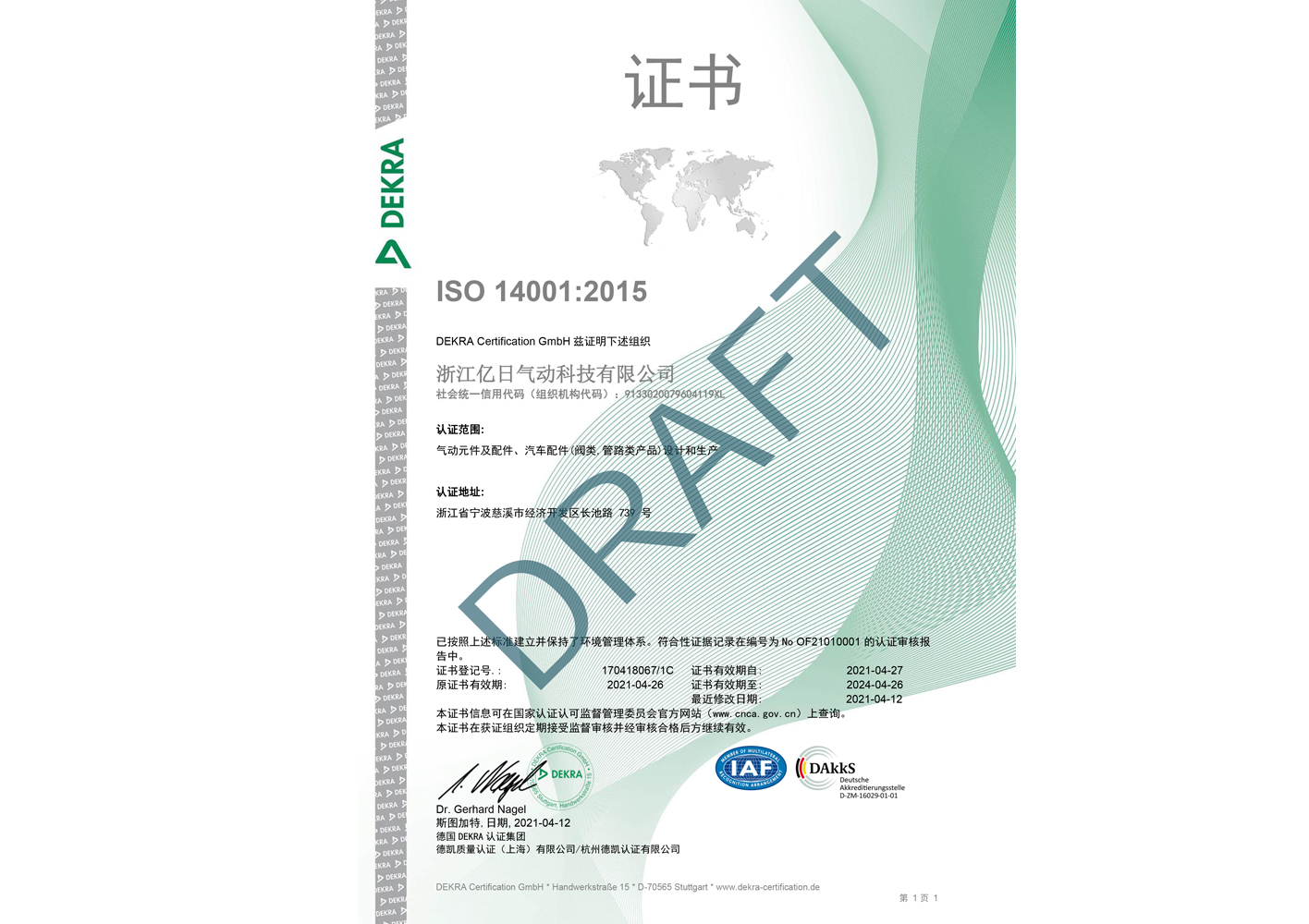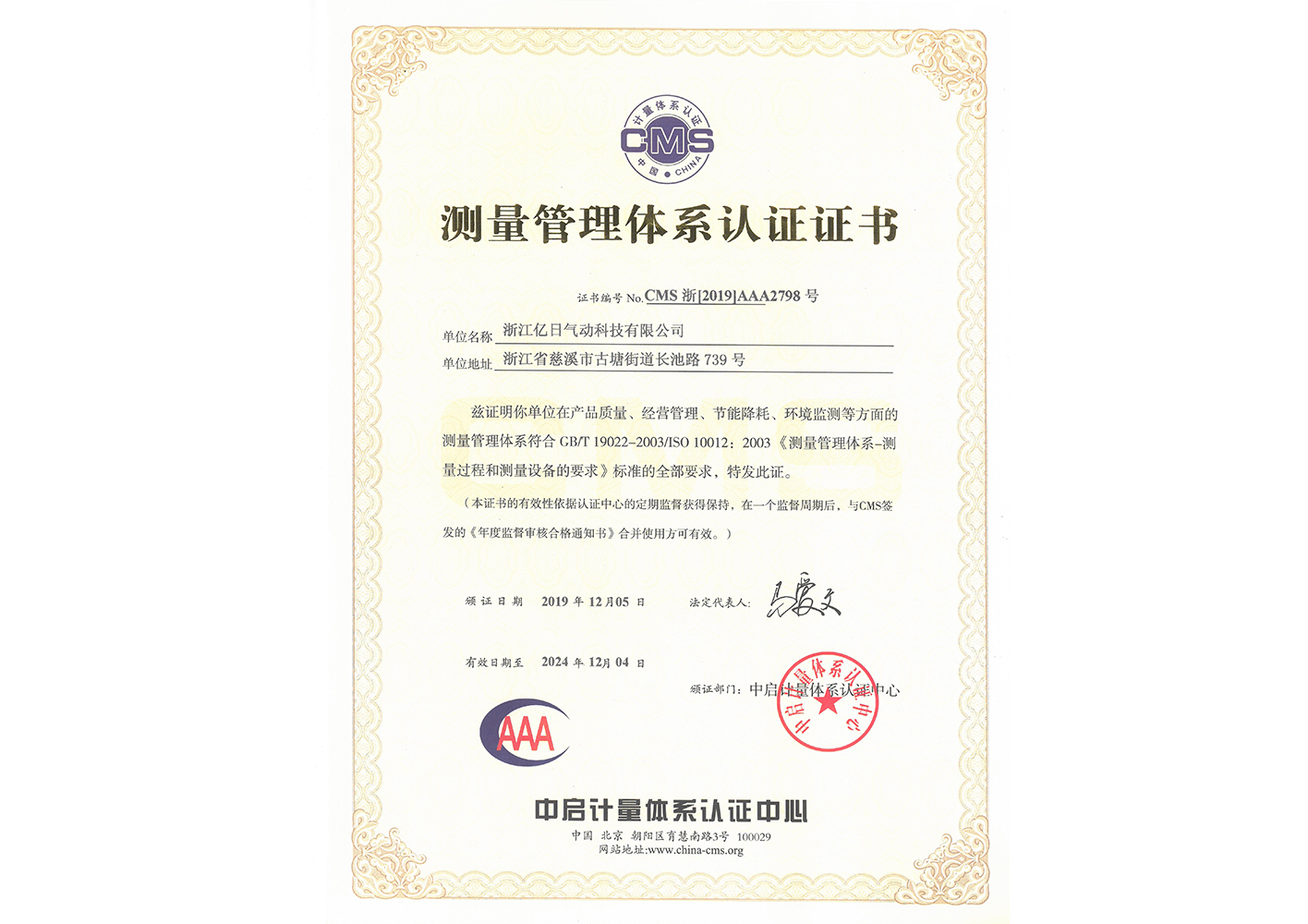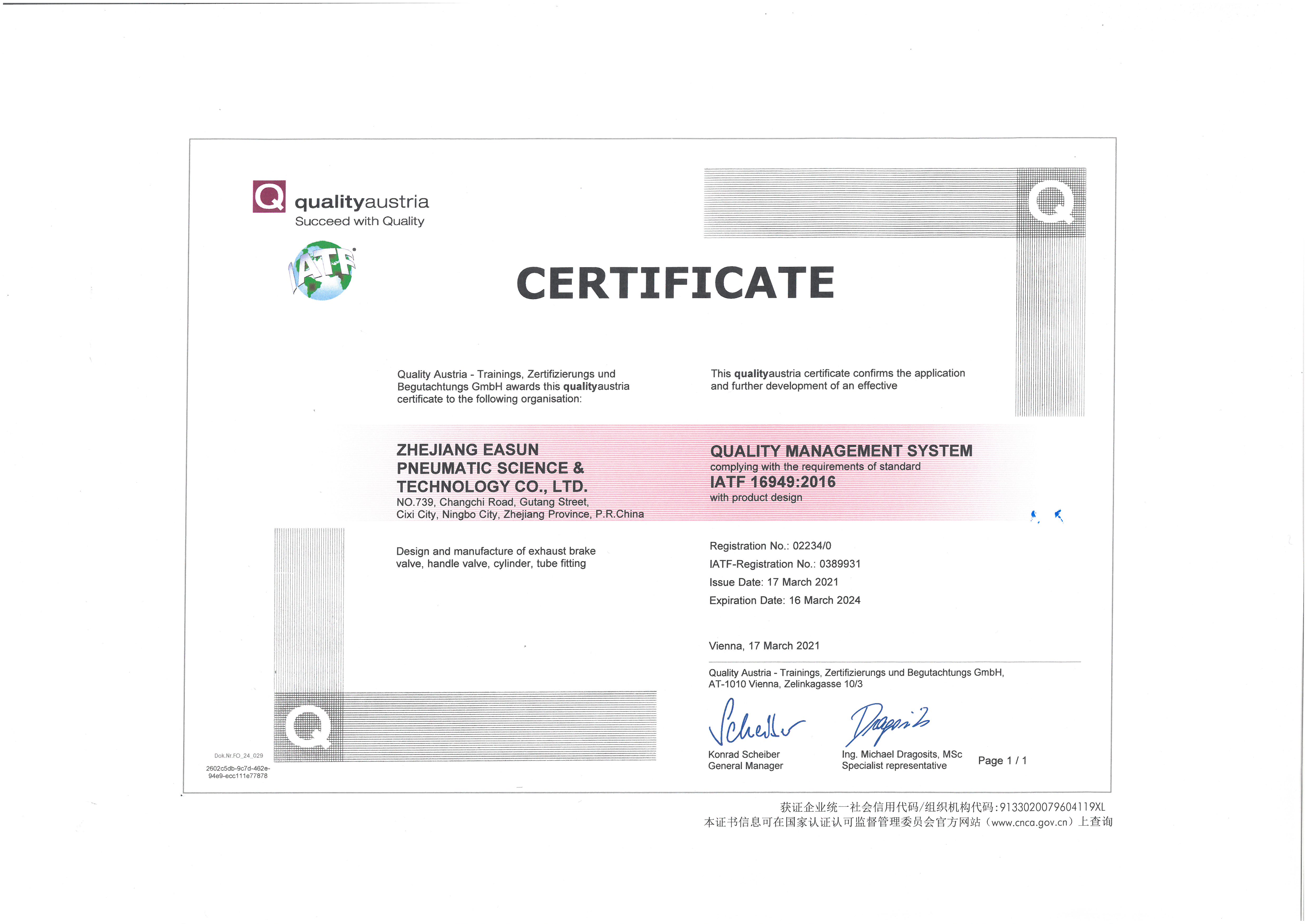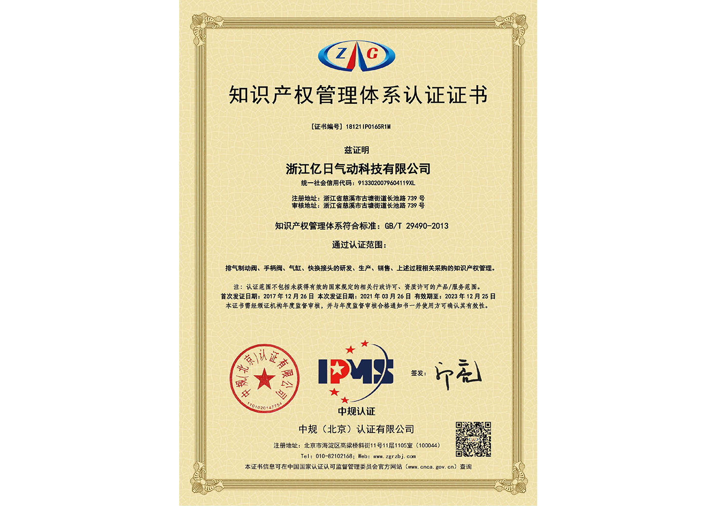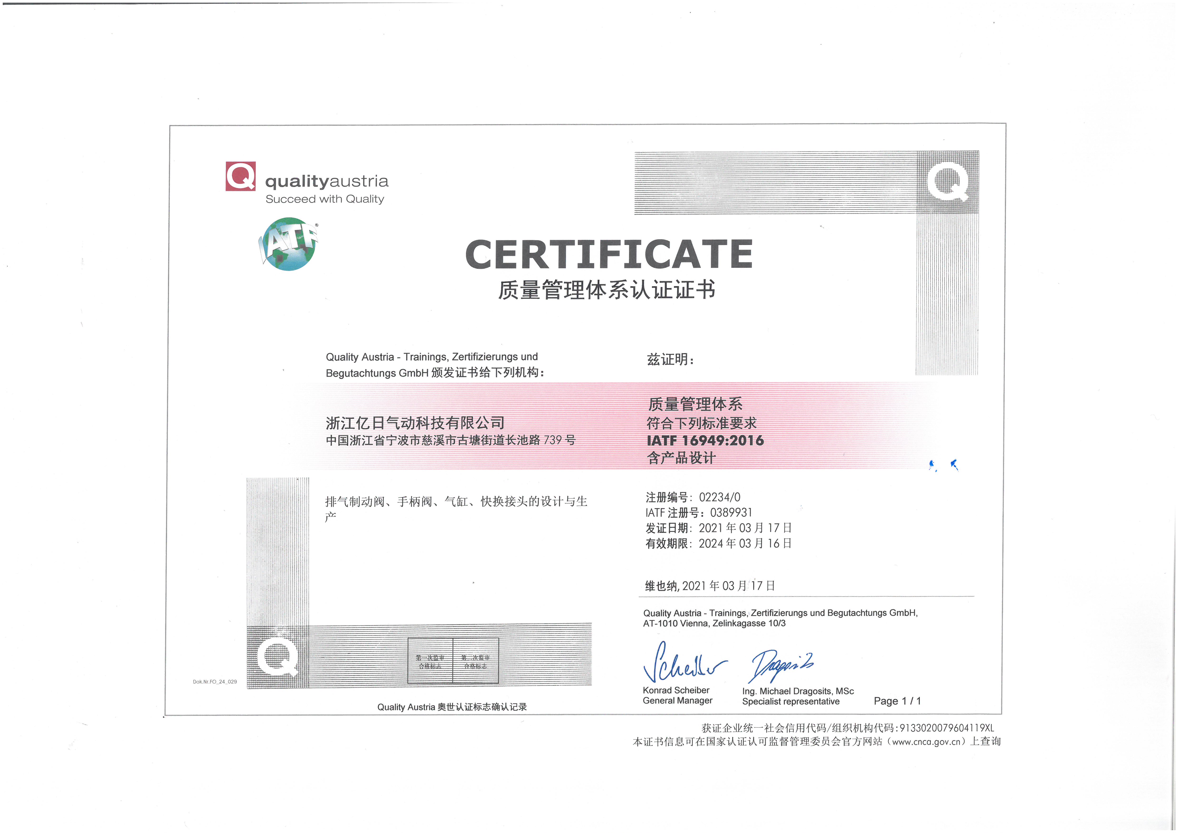 1999年通過ISO9001:2000國際質量體系認證,多種產品獲CE、UL、TUV等認證。并于2010年通過ISO/TS16949體系認證。為了滿足氣動產品技術要求,公司已建立現代化管理模式,具有雄厚的設計研發能力,每年幾十種新產品(申請專利)并投放市場。