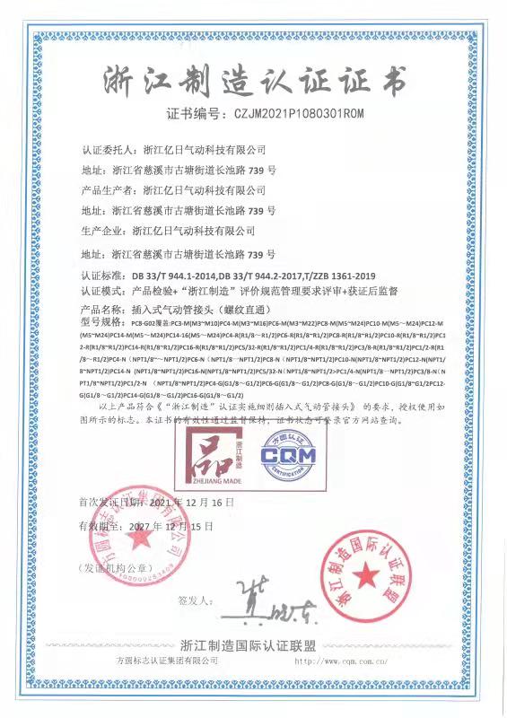 由我公司主導(dǎo)起草制訂的《插入式氣動(dòng)管接頭》的“浙江制造”團(tuán)體標(biāo)準(zhǔn),涵蓋了產(chǎn)品設(shè)計(jì)、材料選擇、工藝控制、性能指標(biāo)、檢測(cè)方法和質(zhì)量承諾等內(nèi)容,其中多項(xiàng)性能指標(biāo)均優(yōu)于國(guó)家和行業(yè)標(biāo)準(zhǔn)。