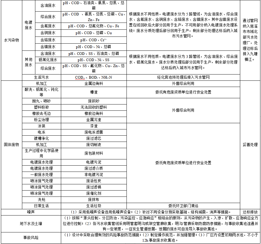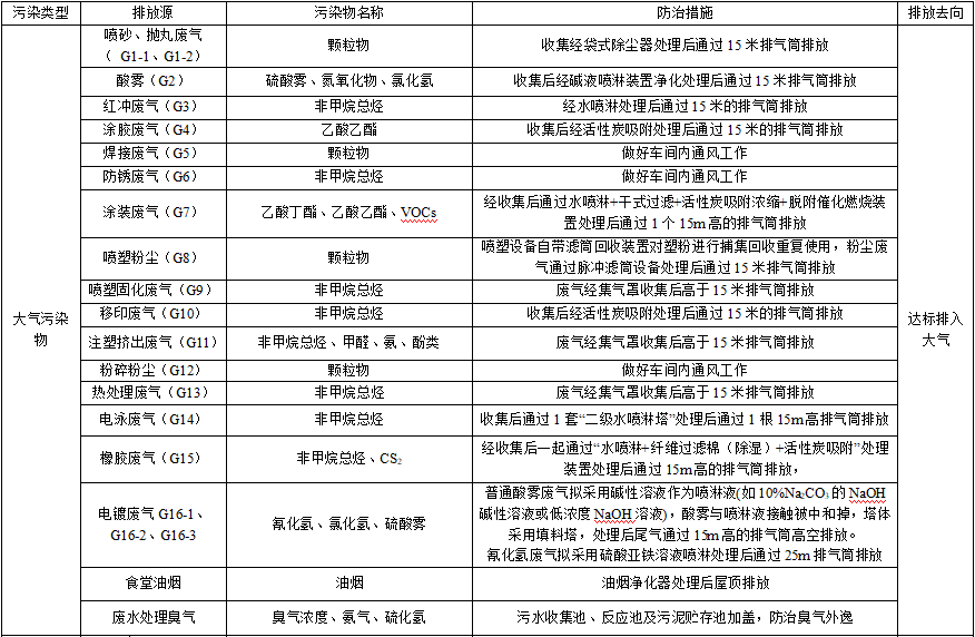 產(chǎn)污環(huán)節(jié)概述:施工期對(duì)環(huán)境產(chǎn)生影響的因素主要有施工揚(yáng)塵、施工噪聲、建筑垃圾、施工人員的生活污水和生活垃圾等;營(yíng)運(yùn)期主要影響是廢水(電鍍廢水、其他生產(chǎn)廢水和生活污水)、廢氣(噴砂、拋丸廢氣、酸霧、紅沖廢氣、涂膠廢氣、焊接廢氣、防銹廢氣、涂裝廢氣、噴塑粉塵、噴塑固化廢氣、移印廢氣、注塑擠出廢氣、粉碎粉塵、熱處理廢氣、電泳廢氣、橡膠廢氣、電鍍廢氣、食堂油煙等)、固廢(一般固廢和危險(xiǎn)廢物)以及設(shè)備運(yùn)行噪聲對(duì)周邊環(huán)境帶來(lái)的負(fù)面影響。